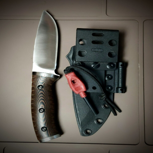 Por lo que respecta el mango, está fabricado con cachas de Micarta marrón y negra y se consigue el equilibrio perfecto gracias a los cabezales de plata. El pomo de este mango tiene la solidez y fuerza suficiente para realizar las funciones de un martillo.