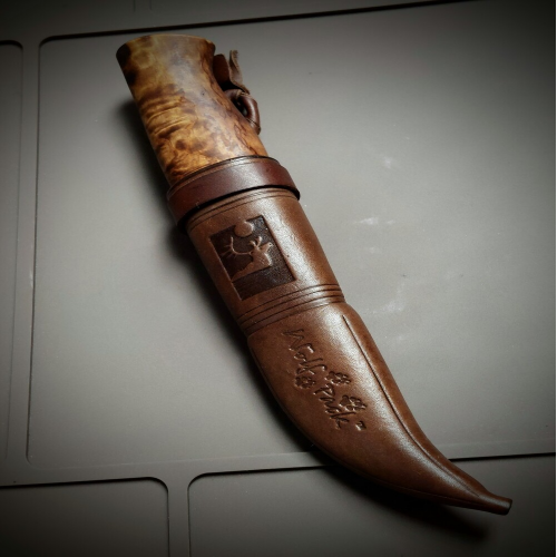 Su hoja de acero al carbono de 2,8". Este lobo tiene la ventaja del sigilo y una increíble habilidad para desollar que no se compara con ningún otro. Viene con una hermosa funda de cuero marrón oscuro y con logo grabado.