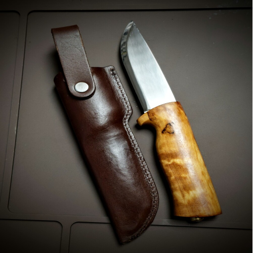 Este cuchillo de ocasion Helle Eggen fabricado en Noruega. Hecho y pulido a mano, tiene un tope para los dedos relativamente fuerte, lo que hace que el Eggen funcione bien como cuchillo de senderismo y de caza. El mango es lo suficientemente grande para que la mayoría de las manos encuentren un agarre cómodo, en gran parte debido al "vientre" sustancial en la parte inferior del mango.