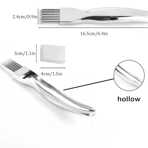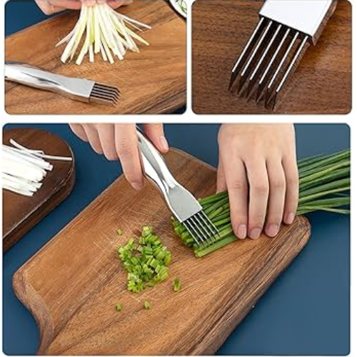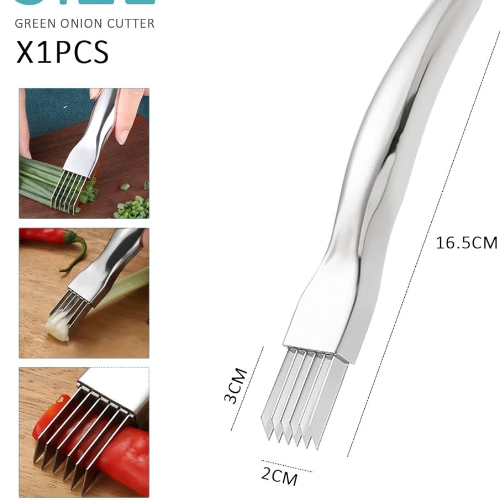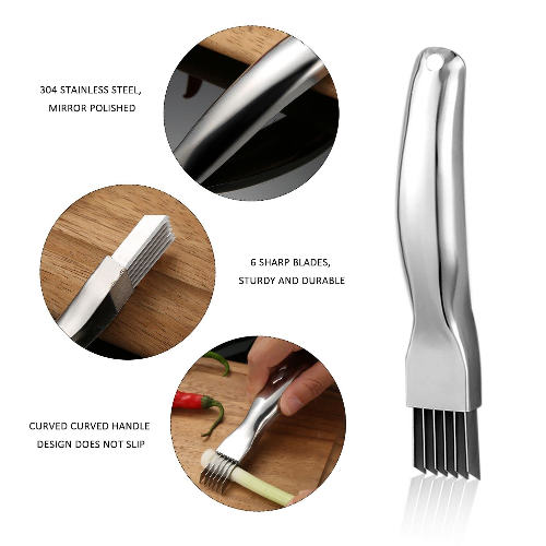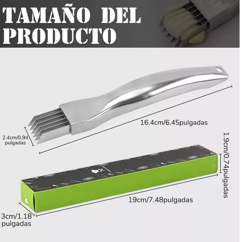 Con este cortador multifuncional, solo basta con poner las verduras en la tabla de cortar y deslizar el cuchillo verticalmente para obtener las láminas.El cortador cuenta con múltiples cuchillas que permiten cortar en dos direcciones distintas, lo que facilita cortar un conjunto completo de cebollas en pocos minutos.También es adecuado para trabajos de decoración de pastelería, ya sea para cortar Fontaine o tallar masa de panqueques y dulces duros.Cubierta protectora, viene con una tapa protectora para el cuchillo, fácil de almacenar y usar, sin preocuparse por accidentes durante el almacenamiento.Ampliamente utilizado, puede cortar cebollas, cebollas galesas, cebollas y verduras similares fácilmente en segundos, dándole más tiempo para reunirse con su familia o amigos.Material: 304 acero inoxidable#843