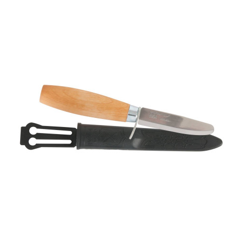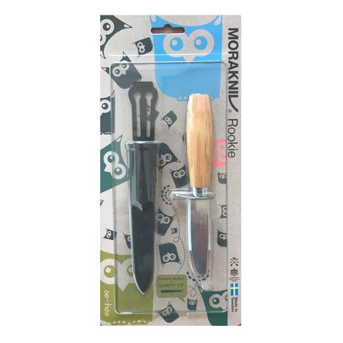 Es cuchillo tiene una punta de seguridad redondeada para evitar lesiones y el protector de dedos evita que los dedos se deslicen sobre la cuchilla. El mango de madera está especialmente diseñado para las manos más pequeñas de los niños y la funda de polímero mantiene la cuchilla y su usuario seguros cuando la cuchilla no está en uso.